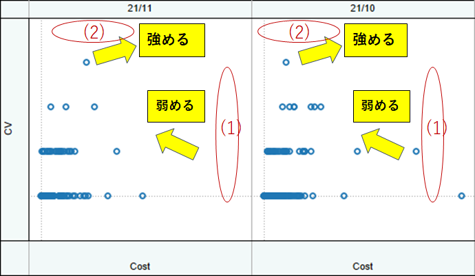 まず費用、CVの2つの指標をグラフで可視化して、次の2つのポイントに着目します。(1)全体成果を悪化させている箇所