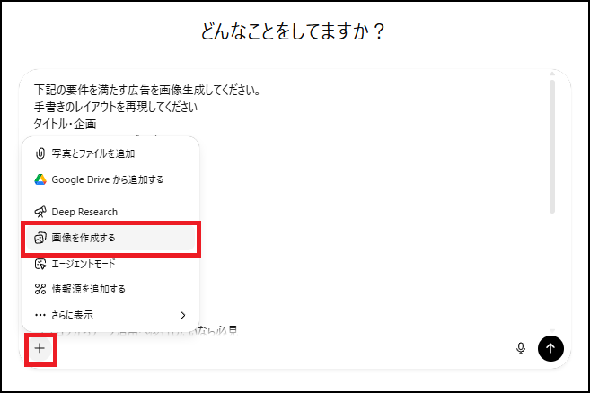 左下の「+」マークから、「画像を作成する」を選択したうえで、プロンプトを実行してください。
