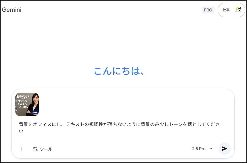 手順はいたってシンプルで、先ほど生成したバナーをそのままGeminiにアップロードし、背景を変えてほしい、服装を変えてほしいなどの指示をするだけです。