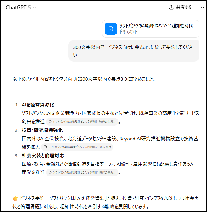 するとAIが「文章を要約」という指示に従って、貼り付けた文章を要約してくれます。
