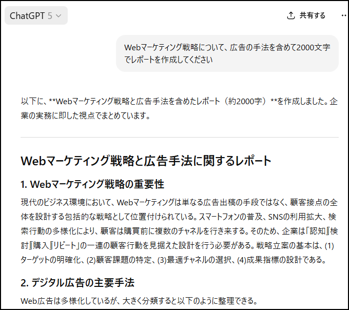 (良い例)「Webマーケティング戦略について、広告の手法を含めて2000文字でレポートを作成してください」