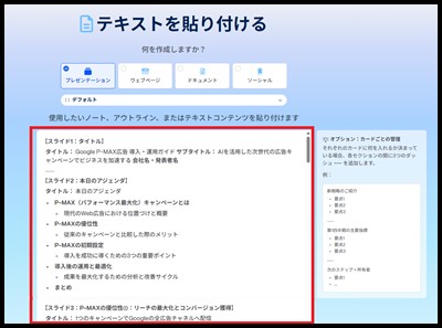 「テキストを貼り付ける」をクリックし、入力欄に、Geminiが作成した構成データのスライド構成案部分をそのまま貼り付けます。