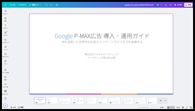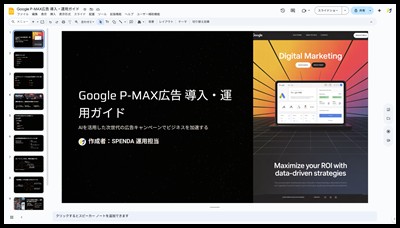 ここでは「GoogleのP-MAX広告の初期設定と運用方法の説明」を目的としたスライドを実際に作りながら、手順を紹介します。