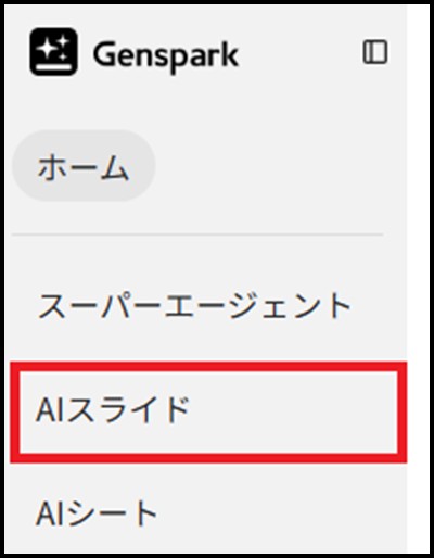 Genspark公式サイトにアクセスし、「AIスライド」をクリック