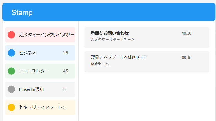 これまでのメールツールは、利用者が自分でフィルタ設定やフォルダ分類を行う必要がありましたが、Stampは自動分類機能があるので、顧客や重要通知は上部に固定表示され、ニュースレターやSNS通知、セキュリティアラートなどは別カテゴリに自動的に振り分けられます。