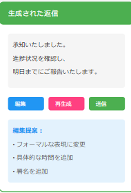 生成された返信は簡単に編集可能で、特定部分だけを変更する指示も出すことができます。