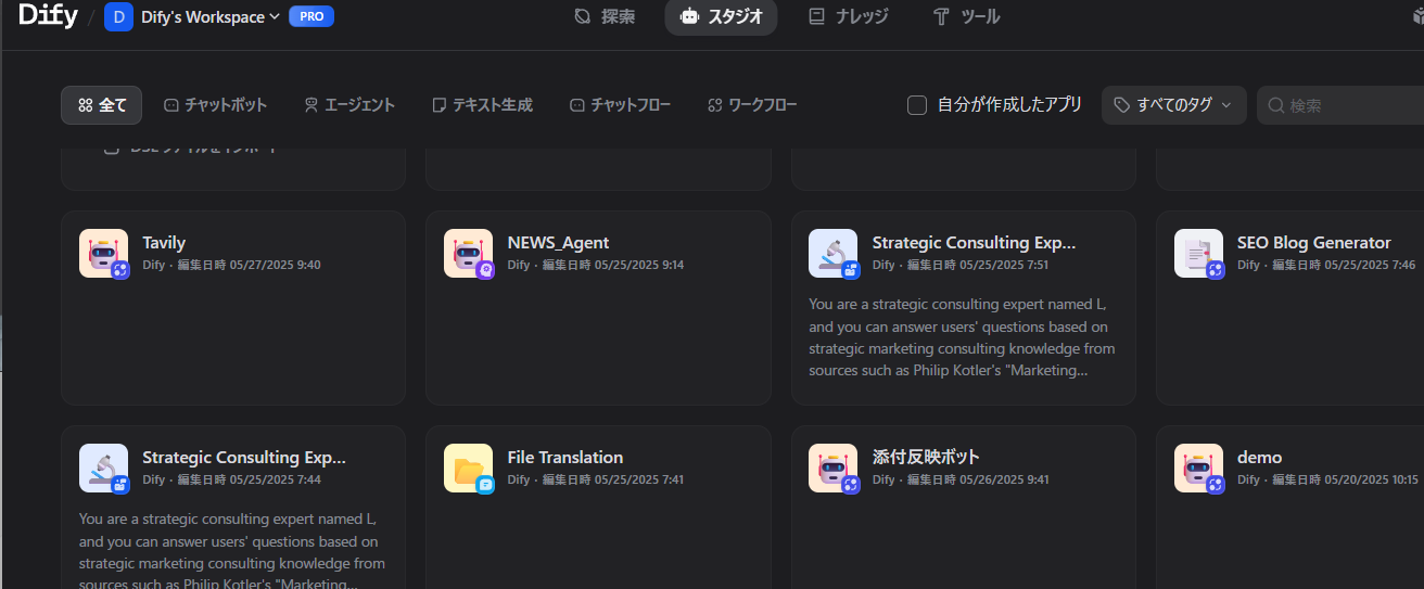 Difyにはテンプレート機能が用意されていますが、初心者にとっては扱いが難しい場合があります。特に、ワークフローの中には専門的な知識を必要とする設定が含まれており、いきなり活用するにはハードルが高いことが多いです。そのため、まずはテンプレートを使用するのではなく、完成済みのファイルをインポートし、その中身を確認しながら仕組みを理解するアプローチが有効です。