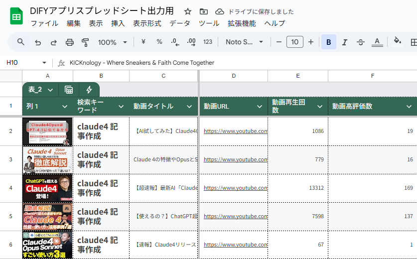 Difyを活用することで、これまで手作業で行っていたキーワードリサーチ業務を大幅に効率化できます。具体的には、YouTube APIを用いて、人気動画の視聴回数や評価データを自動で取得し、その結果をスプレッドシートに出力する仕組みを構築しています。