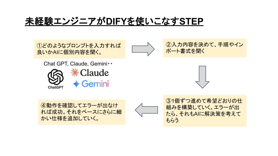 Difyを活用して作業を進める際は、まず目的を明確にし、その上で必要なプロンプトや手順をAIに相談しながら進める方法がおすすめです。具体的には、ChatGPTやClaude、GeminiといったAIツールを併用し、何を決めるべきか、どのようなステップで作業を進めるべきかを都度確認しながら進行すると、作業の効率が大きく向上します。