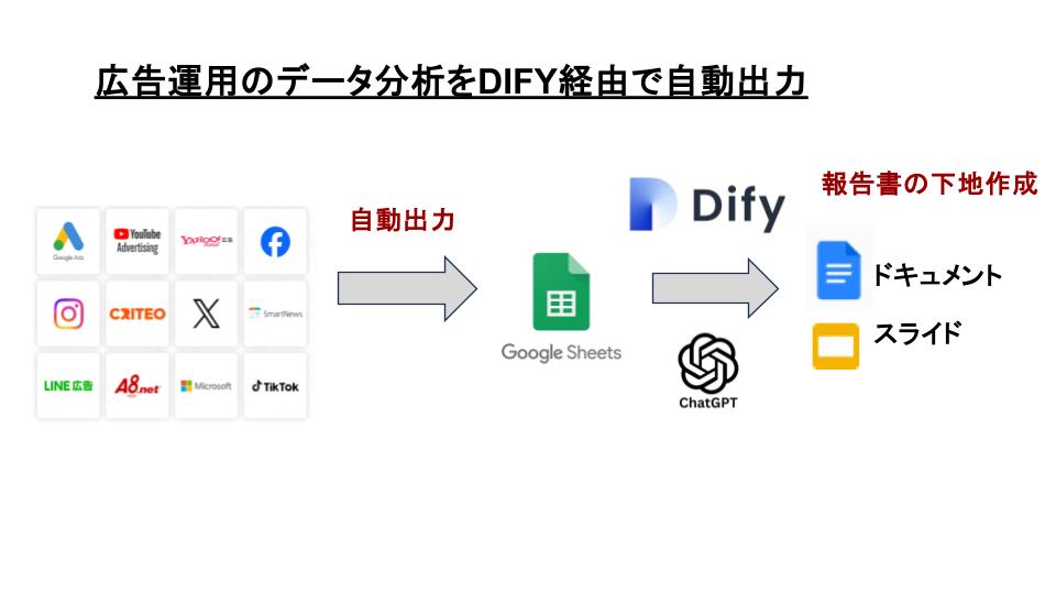 Difyは、広告データの分析業務にも活用できます。たとえば、Google広告のキーワードデータを自動でスプレッドシートに出力し、そのデータをもとにAIが分析結果を生成するフローを構築しました。これにより、従来は手作業で行っていたデータ整理や分析作業にかかる時間を大幅に削減できます。
