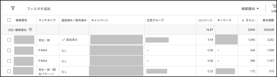 2025年になって検索キーワードが確認できるようになったP-MAX広告の検索キーワードもこの中にまとめて表示され、マッチタイプ欄には「P-MAX」と表示されます。