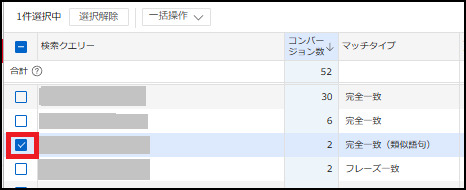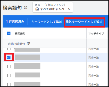 除外キーワードをする場合は、除外対象の検索語句にチェックを付けて「除外キーワードとして追加」をクリックします。