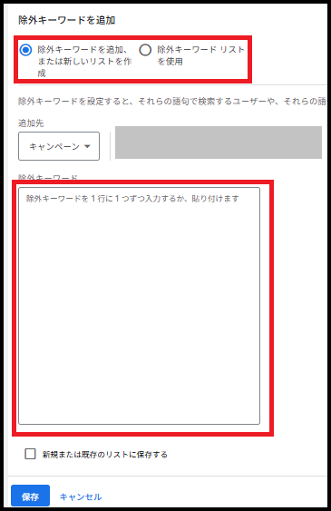 「除外キーワードを追加」を選択し、下の「除外キーワード」欄に除外する検索キーワードを一括で入力。