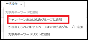 上の「一括操作」から、「キャンペーンまたは広告グループに追加」を選択し、追加するキャンペーン・広告グループを選択して保存すれば、完了です。