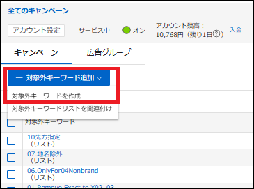 それぞれキャンペーンに紐付けることができ、紐付けたキャンペーンには、リスト内に設定してある除外キーワードが一括で適用されます。