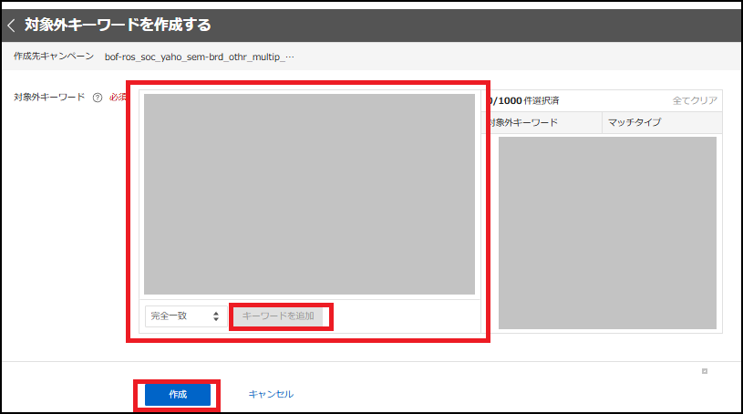 対象外キーワード欄に追加 →マッチタイプを選択後、「キーワードを追加」→右側枠内にキーワードが表示されるので、確認して「作成」
