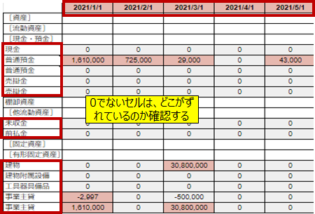 すべて0になれば一致しているし、0でない部分があれば該当の勘定科目と月の仕訳を見直してずれを直していきます。