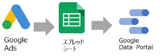 下記のようにGoogle広告からスクリプトの指示でスプレッドシートへ自動出力、