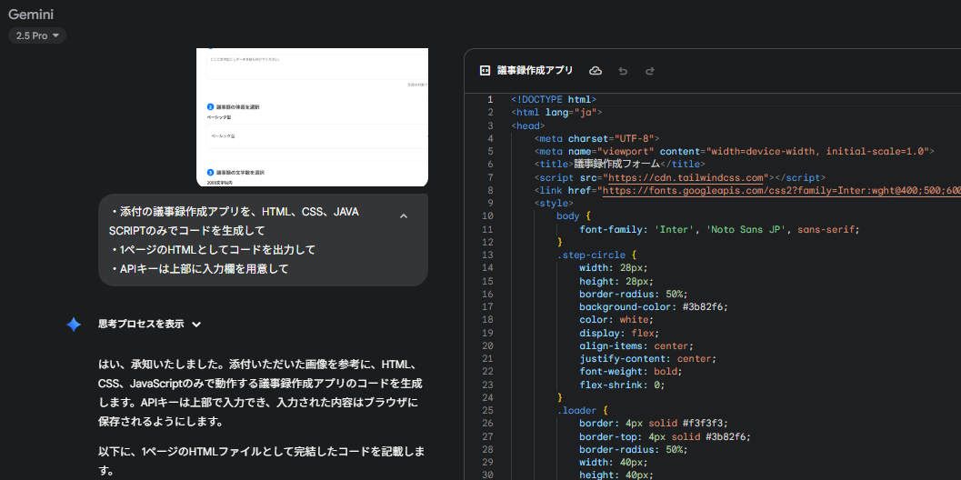 Geminiでのアプリ作成は驚くほどシンプルです。完成イメージの画面キャプチャを用意して、それをGeminiに添付して「HTMLとCSS、JavaScriptのみでコードを生成して」と指示するだけです。使う人それぞれでGeminiのAPIキーは異なる場合は、その入力欄も上部に設定する指示を出します。
