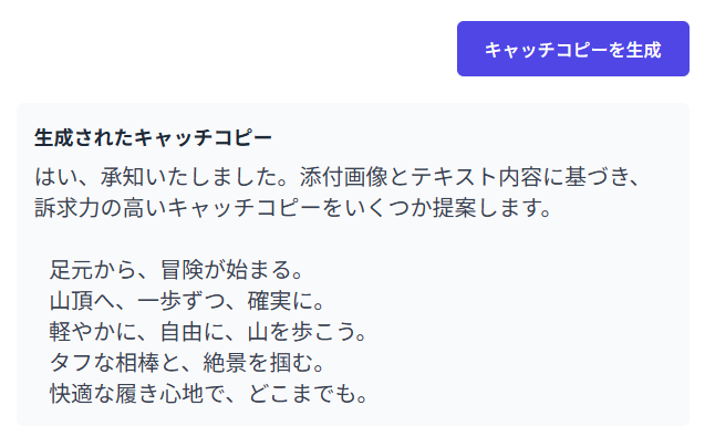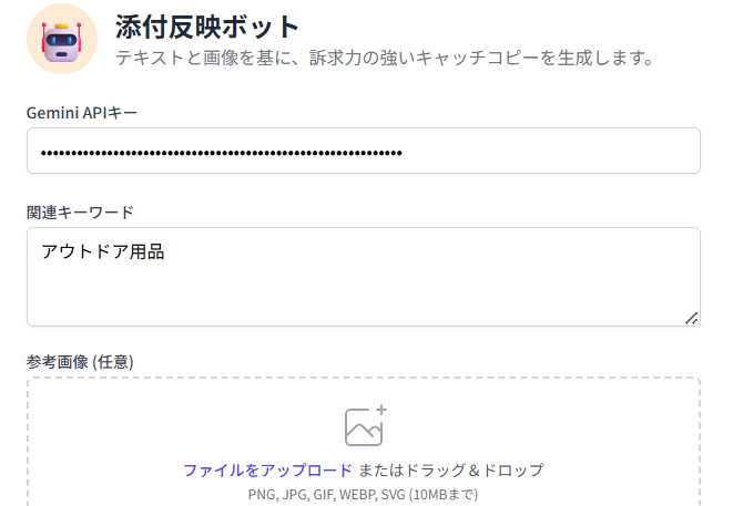 次に過去のバナー広告のキャッチコピー一覧をPDFで添付して、同じブランドの新商品のバナー広告を作成するときのキャッチコピーをGeminiに20字以内で考えてもらうアプリです。