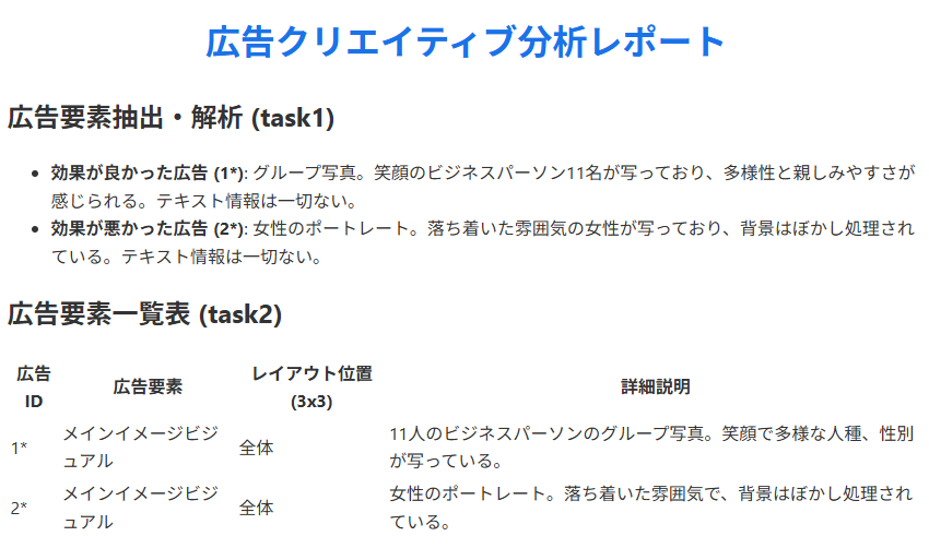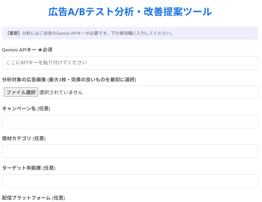 次にバナーや広告の画像素材を複数アップロードして、Geminiが見た目を比較して分析、考察した結果を出力するアプリを作成してみます。マーケティングではA/Bテストとして、商品写真の比較検討やデザイン案の評価に活用できるものです。