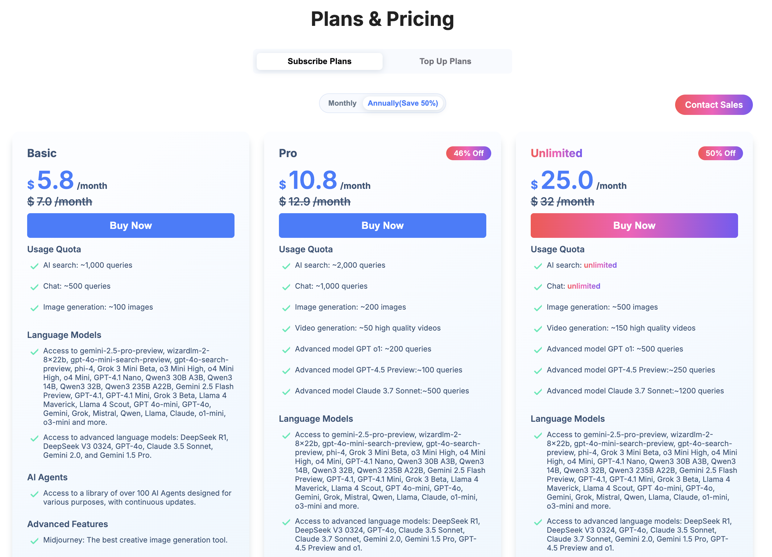 - Proプラン: 月額10.8ドル(約1,500円)からで、本格的に使いたい方向けの標準プランです。Proプランは高度なGPT-4.5(OpenAI最新モデル)の応答を100回、Claude 3.7を500回など高性能モデルの利用枠も含まれます。基本的な機能は使えるため、個人的には一番オススメなプランです。