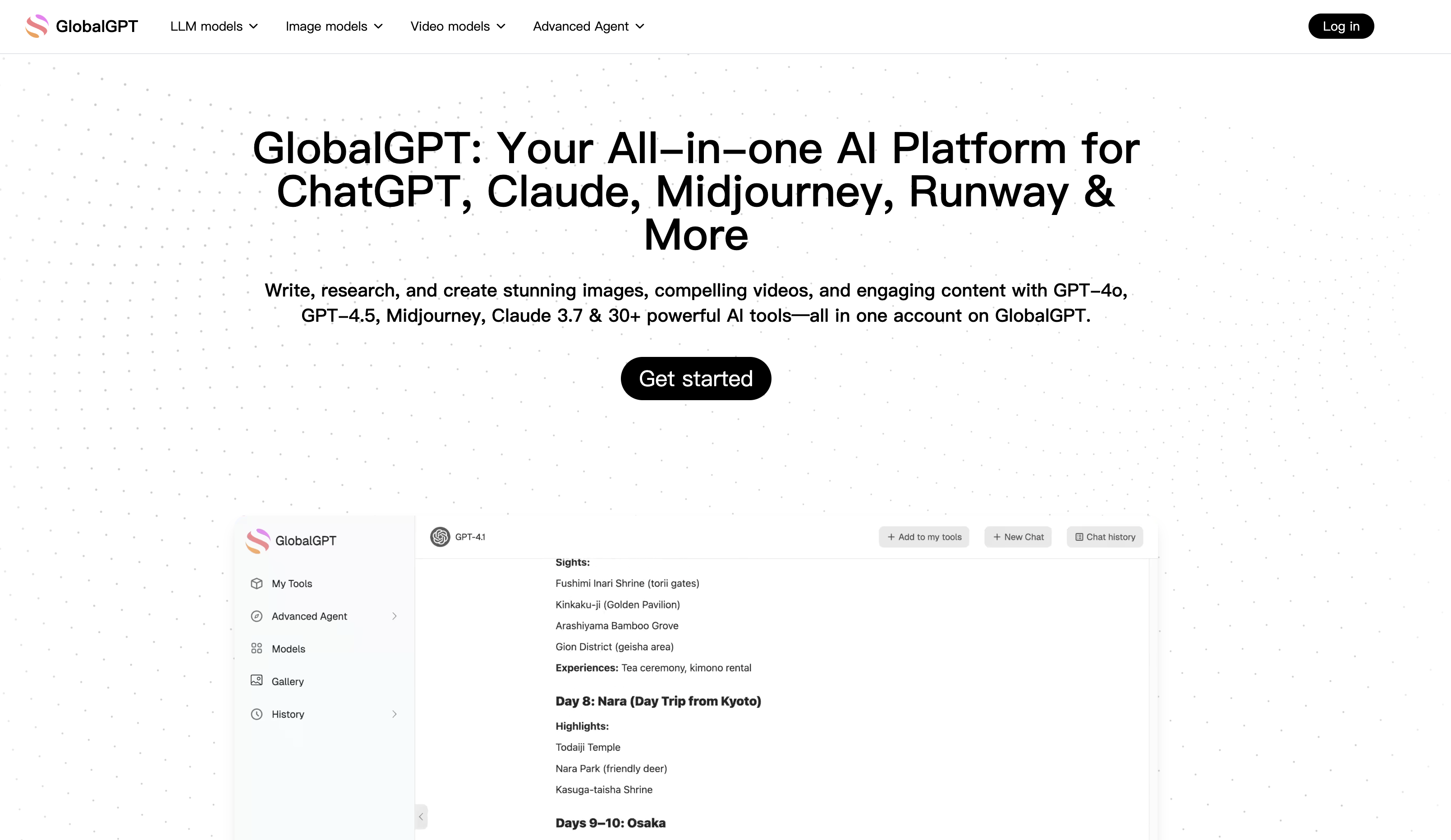 GlobalGPTは、ChatGPTやClaude、Midjourneyといった複数の最先端AIツールを1つのサービス画面内で利用できるオールインワンAIツールです。2024年3月に米国のFuture Share LLCによって開発され、日本を含むグローバルに提供が開始されました。