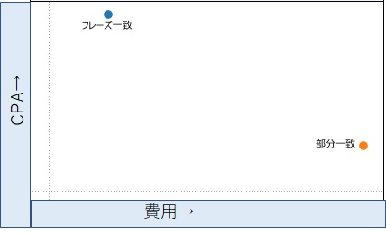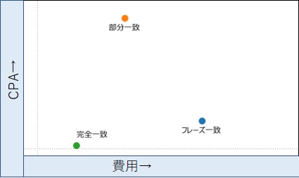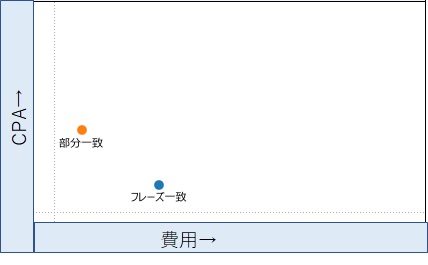 どちらのほうが良いか傾向を見るために、マッチタイプ別の費用とCPAの結果をグラフにプロットしました。