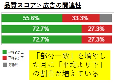 この結果だけで必ずしも悪いとは言えないですが、CPAの上昇と連動して「平均より下」の割合が増えているので、このキャンペーンでは全体的に「部分一致」があまり良くなくて「フレーズ一致」に戻したほうが良いということになります。