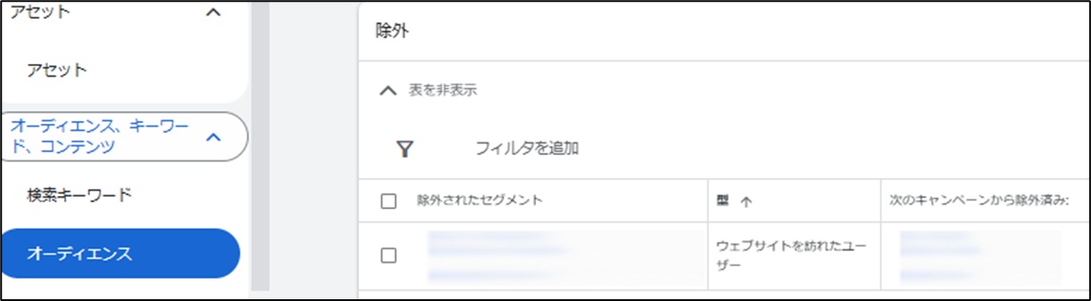 これを該当するキャンペーンの設定画面で、除外オーディエンスのところからオーディエンスを選択して設定します。