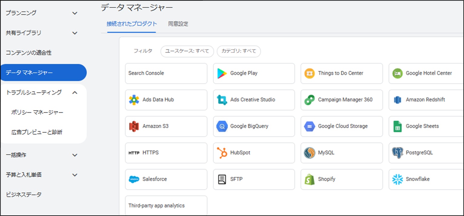 Google広告の「データマネージャー」から連携したいツールを選んで、連携作業を進めていきます。