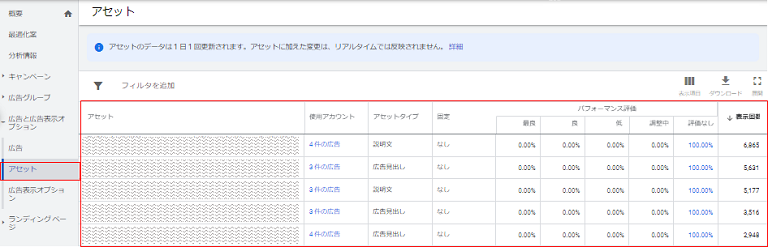 運用者の方は、検索レスポンシブ広告のアセット別の結果も下記で確認していることと思います。こちらは相対的な評価と数値は表示回数だけが表示されます。