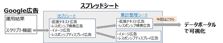 Google広告からスプレッドシートへデータを自動出力して、可視化するまでのデータの流れは下記のとおりです。スプレッドシート内でrawデータを一旦出力して、数式を使って別のタブへ「拡張テキスト広告」「レスポンシブ検索広告」だけをアセット別に出力します。