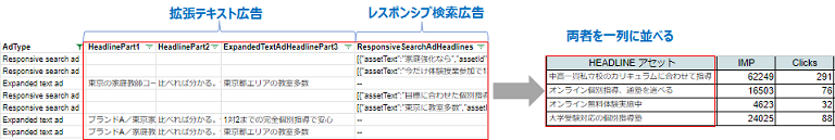 次に、下図のようにスプレッドシート内で、拡張テキスト、レスポンシブ検索広告のアセットを一列に並べて、それぞれの結果を右側に集計します。