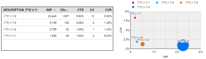 ただ、検索レスポンシブ広告については合算値であり、個々のアセットの結果は見ることができません。
