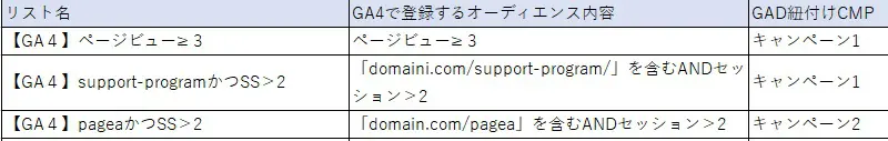 | 入札戦略/td> | 手動入札:個別クリック単価/自動入札:コンバージョンの最大化、目標コンバーション単価などを選択 |