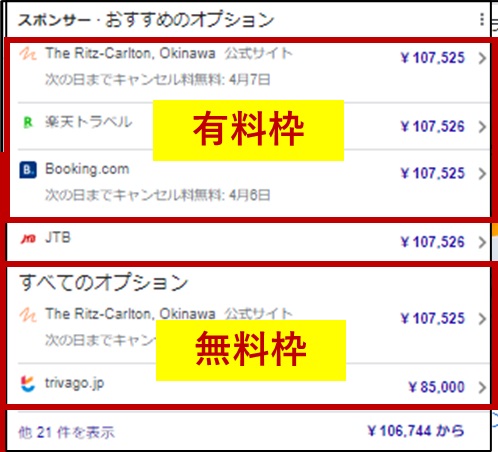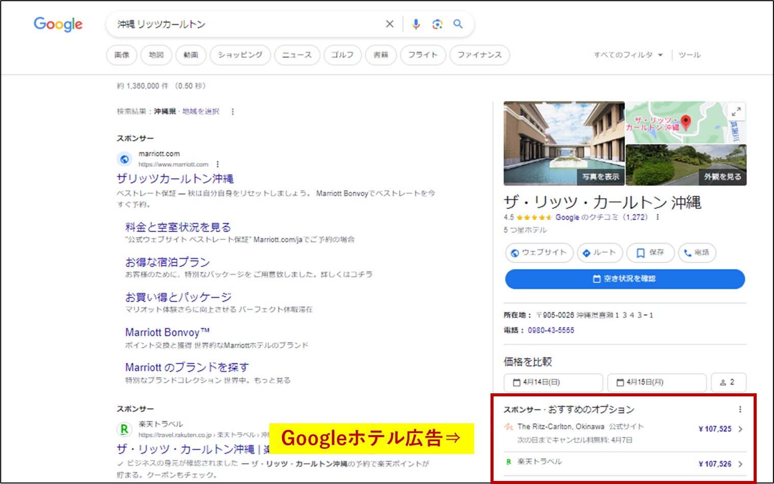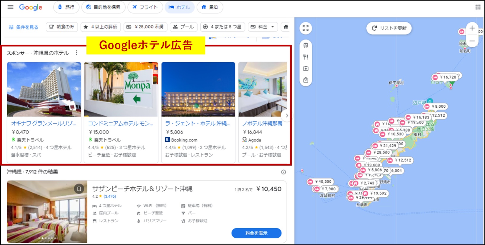 そして「スポンサー」と書かれた項目の下に出てくるのが有料広告で、ホテル広告もここに表示されます。