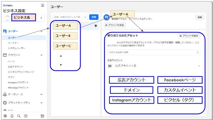 ビジネスマネージャー内の「ビジネス設定」欄の「ユーザー」をクリックすると、権限を付与したユーザー(社内の従業員など)の一覧が表示されます。一旦ビジネスマネージャー内に招待した後に、広告アカウントの権限付与を行いますが、広告アカウントの権限だけを付与しても、Facebookページやピクセルタグの権限は自動的に付与されないのでこの点は注意が必要です(Google広告やYahoo!広告とは異なります)。