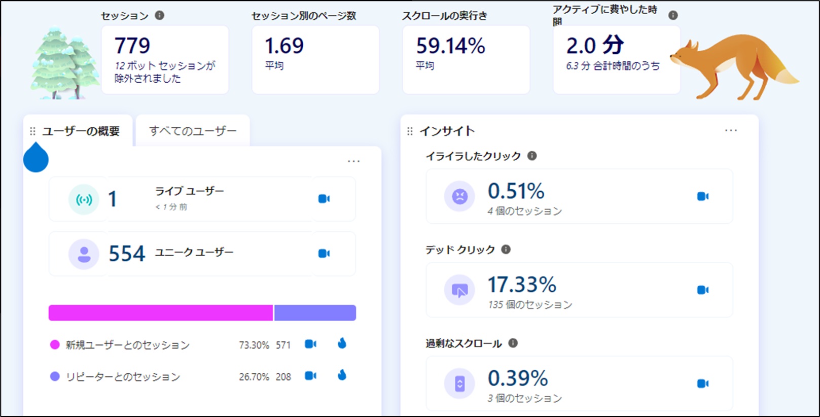Microsoft Clarityは、Microsoft社が提供しているWEBサイトのユーザー行動を分析する無料ツールです。ヒートマップ、セッション録画、リアルタイムのユーザー行動が画面内で確認できます。