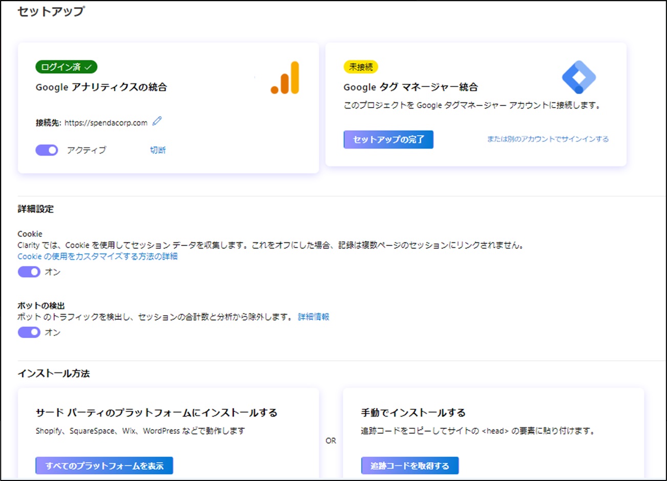 Clarityアカウントを作成し、「設定」→「セットアップ」の画面で発行されるトラッキングコードをWEBサイトのHTMLに挿入することで、データの収集を開始できます。