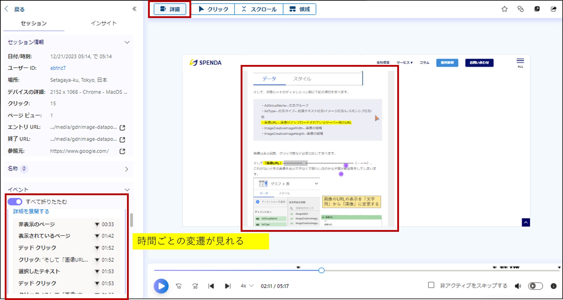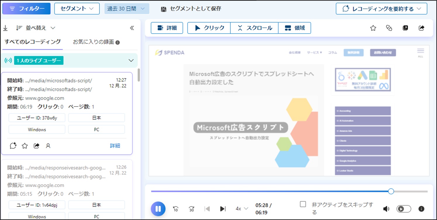 「レコーディング」→「詳細」をクリックすると、下記のように実際のサイトの画面と左下に時系列でユーザーがどのような動作を行ったのか確認できます。