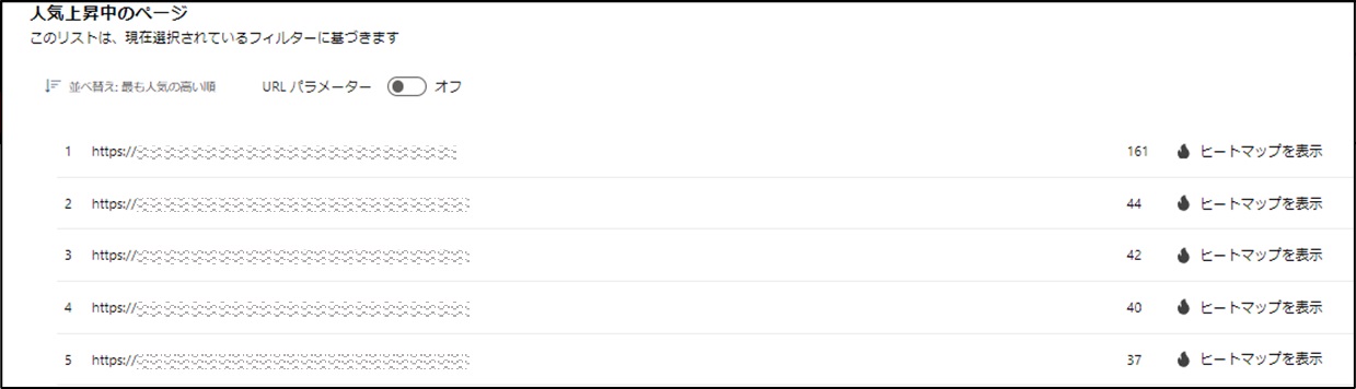 画面上部の「ヒートマップ」をクリックすると、ページ一覧が表示されます。この時「人気急上昇中のページ」でClarityが基本的には流入の多い順にページを整理して表示してくれます。