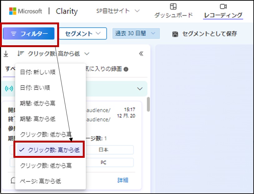まず一般的に重要なのは、流入数やマウスクリックが多いページです。Clarityでも「フィルター」機能を使うことで、クリックが多いページの順番に並べることができます。