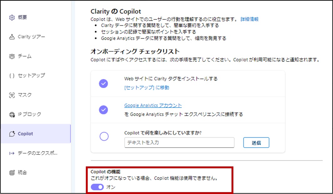 OpenAI言語モデルによるGPTを使用したCopilotもClarityに搭載されています。基本設定である、ClartiyタグのインストールとGA4アカウントの連携が済んでいれば、あとはサイドバーの設定で「Copilot」が「オン」になっていれば活用できます。