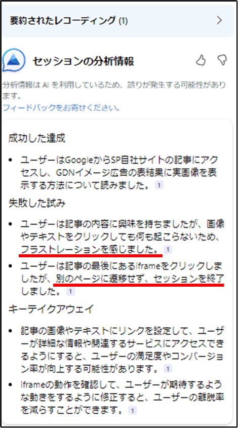 「フラストレーションを感じた」「別ページに遷移せず、セッションを終了した」など改善点があぶり出されました。
