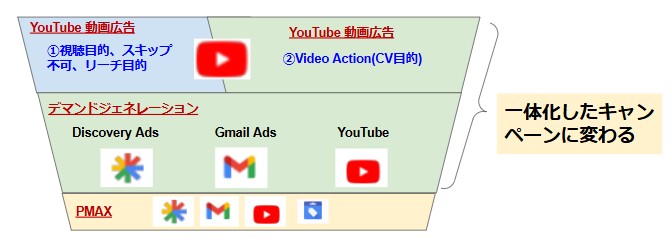 従来、YouTube広告の獲得目的のメニューとして提供されていたビデオアクションキャンペーンは、デマンドジェネレーション(Demand Gen)キャンペーンへ統合されます。