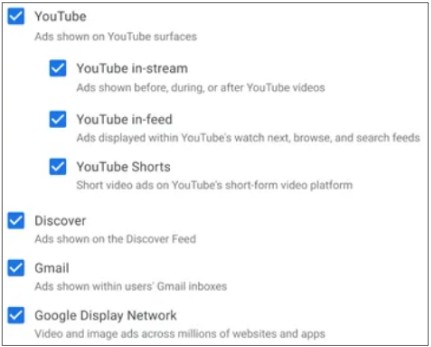 デマンドジェネレーションキャンペーンでは、広告が表示されるGoogle内の場所(YouTube、Discover、Gmail、Googleディスプレイ)をチェックを入れることで配信有無を選択できるようになりました。