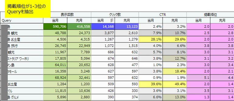 Tableauのフィルタで「掲載順位が1-3位」のクエリで抽出しました。