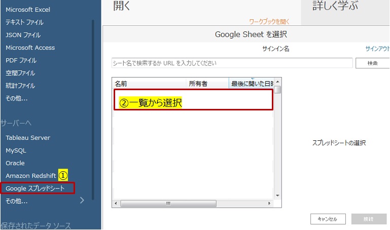 まずTableauを開いて、データソースで該当のスプレッドシートを選択して接続します。