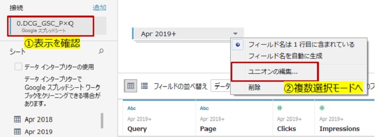 データソースが表示されたら、「ユニオンの編集」を選択して
